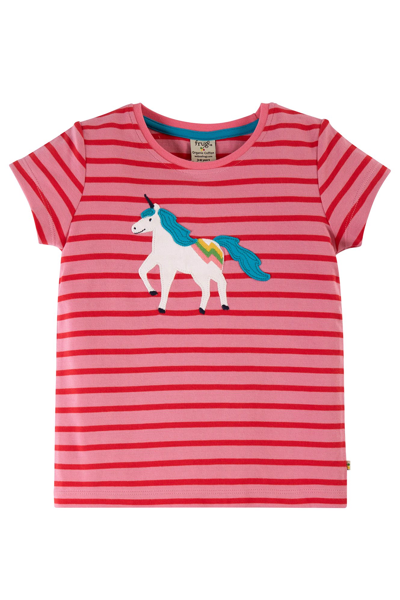 Frugi Camille Applique Tee, Red Pink Stripe/Unicorn