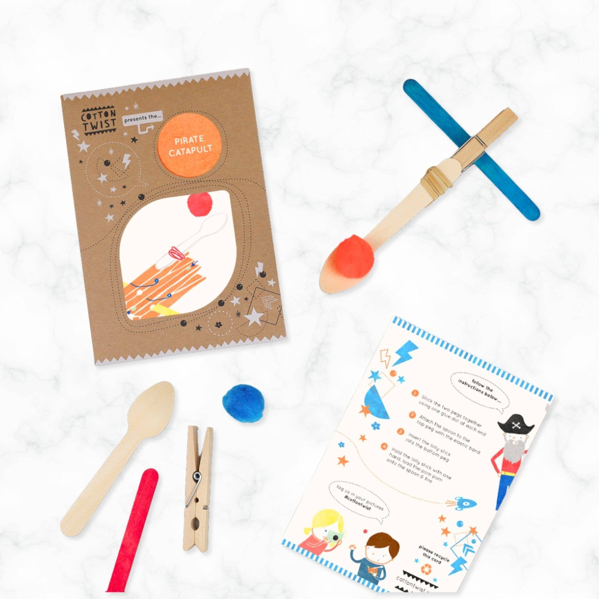 Children can construct a catapult using the pegs, lolly sticks, spoon, elastics & glue dots. Add a pom pom to the spoon & see how far it can fly in the air. Practice makes perfect on the pirate aim. In a bid to banish plastic from our homes, Cotton Twist products are lovingly assembled by hand, & all components are as good as we can possibly make them.