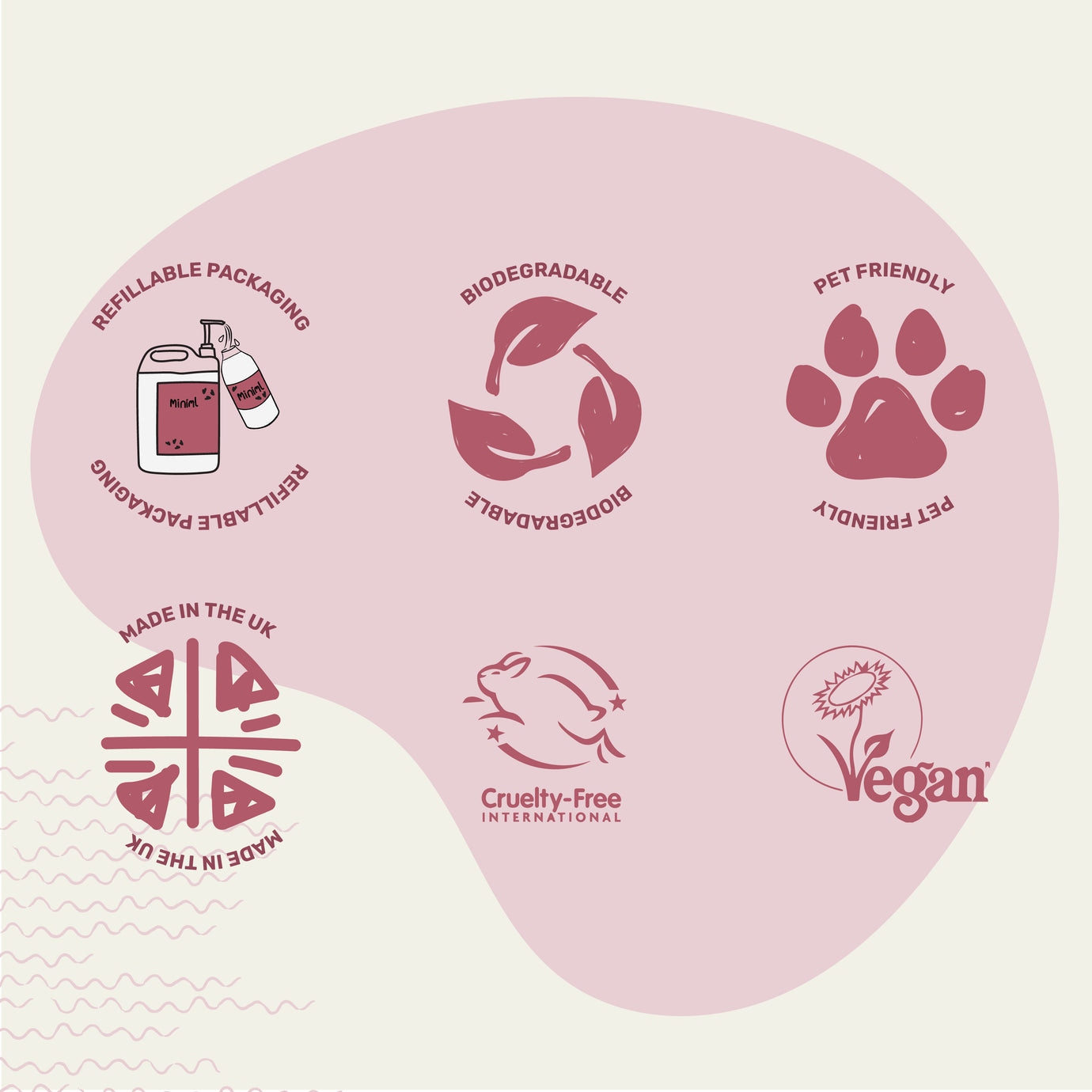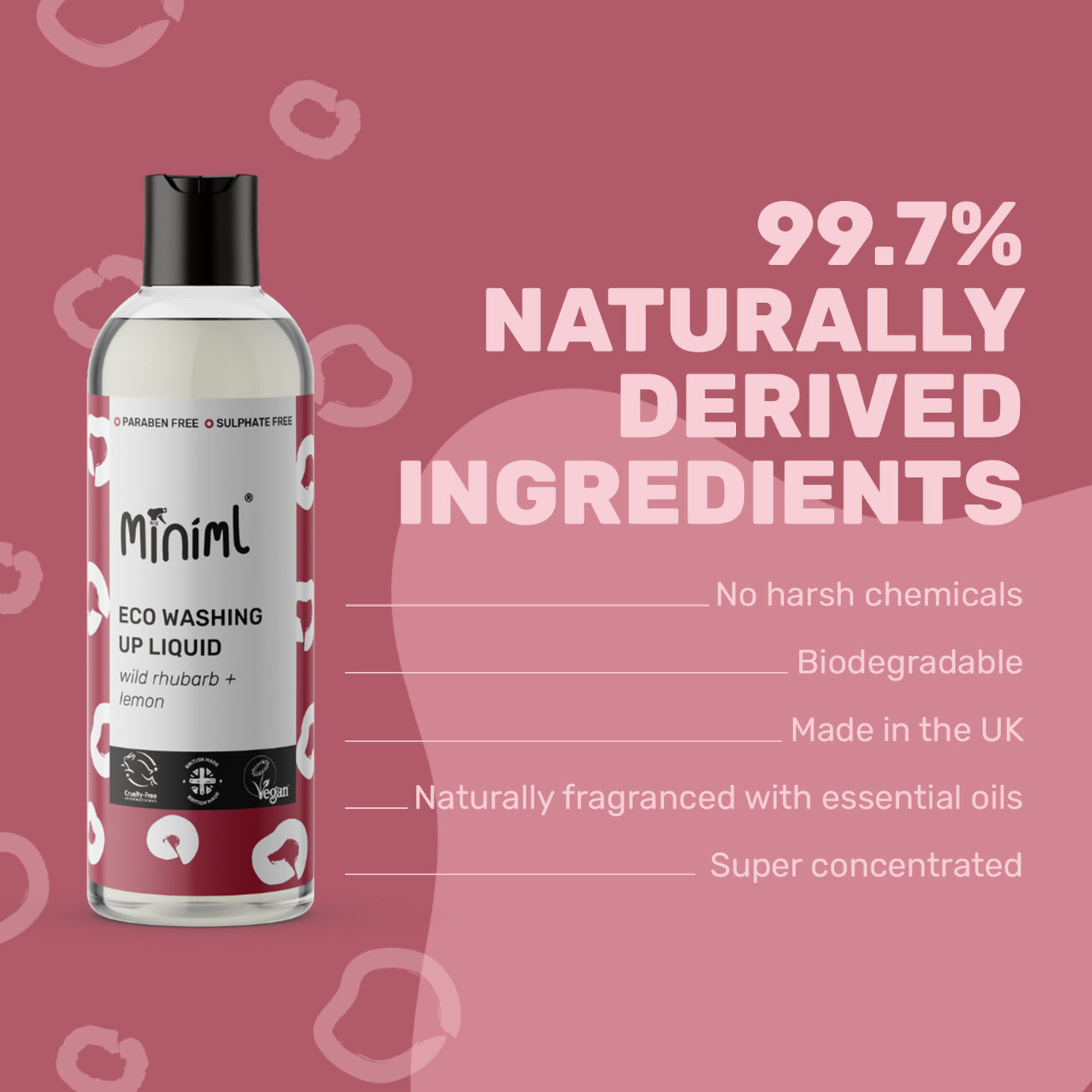 Aqua**, <5% Anionic Surfactants*, <5% Non-Ionic Surfactants, <5% Amphoteric Surfactants*, Potassium Sorbate*, Sodium Benzoate*, Perfumes. *Denotes plant or mineral origin. **Water from The Yorkshire Moors. For a detailed what's what, go to Miniml's ingredients page.