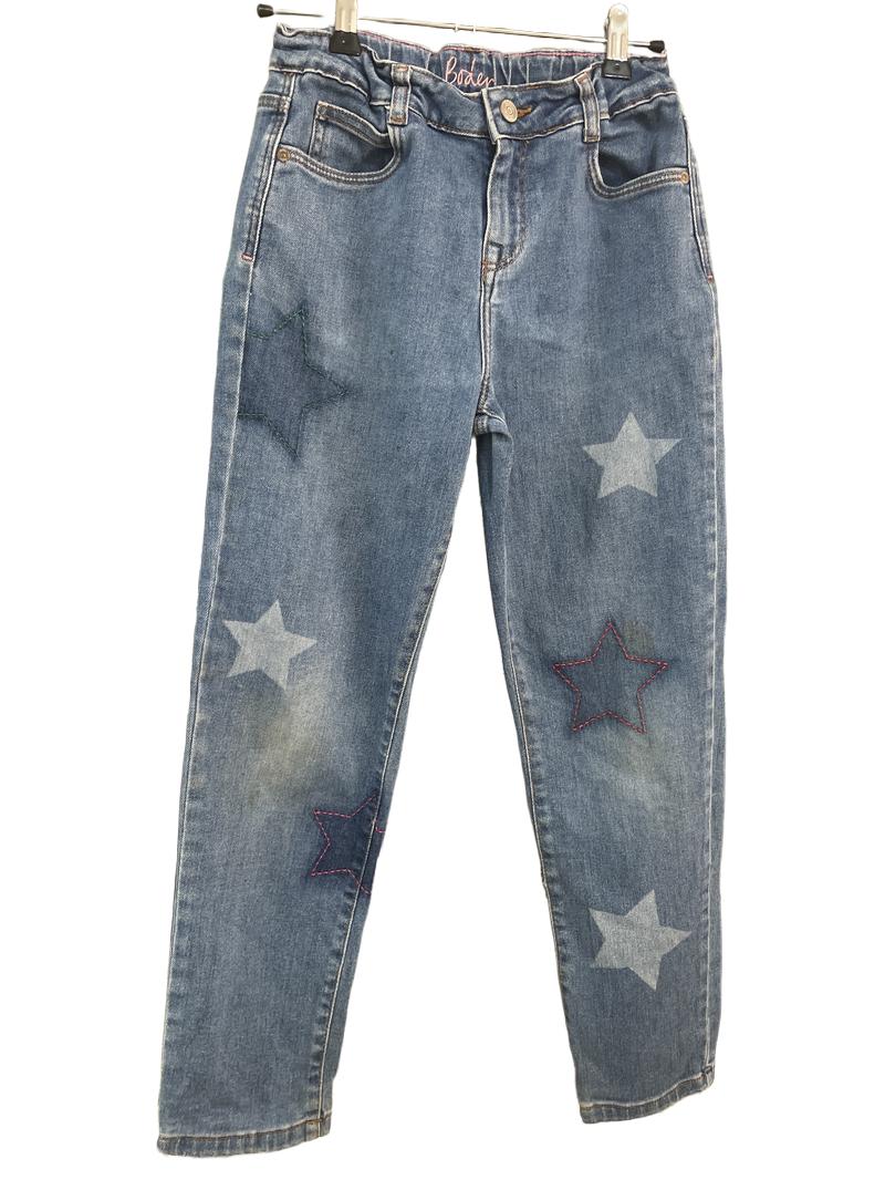 These Boden blue jeans are a stylish and durable choice for active kids. Featuring fun star appliques and subtle fading, they offer a playful touch to a classic design. While they show light wear on the knees and a couple of small spots near the fly on the left leg, these jeans are still in very good condition and ready for more adventures.