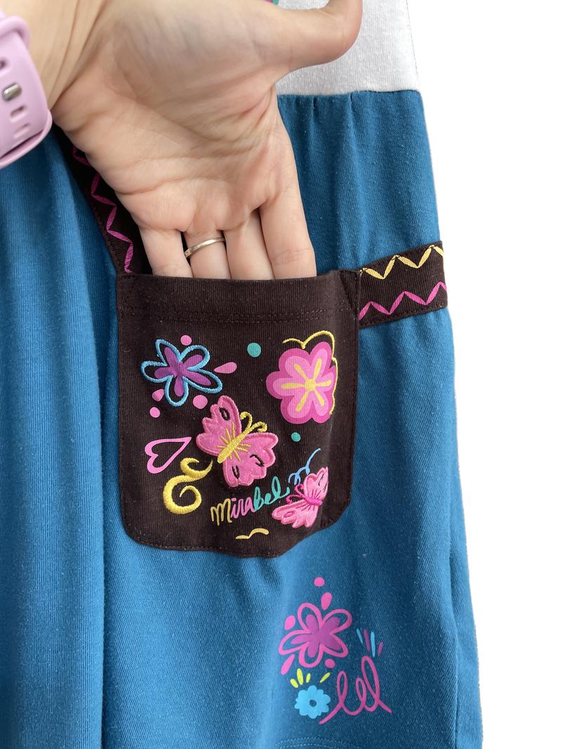 This delightful Mirabel Encanto dress is perfect for your little one! The top features a charming image of Mirabel, and the teal skirt adds a pop of color. There is a cute embroidered pocket and details on the skirt. There is some light bobbling, otherwise in very good condition.