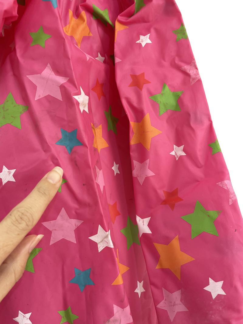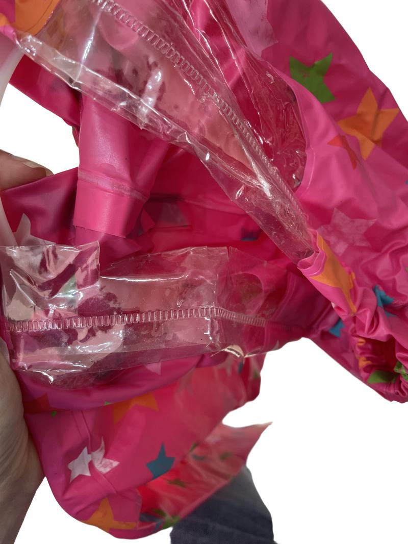 Keep your little one dry and stylish with this preloved Hema B.V. waterproof jacket! Featuring a vibrant pink background adorned with playful multicolor star prints, it's perfect for rainy day adventures. While it shows some wear to the pattern, some dark marks on the back center, and small cuts to the hood material, it still offers reliable protection and a cheerful look for outdoor fun.