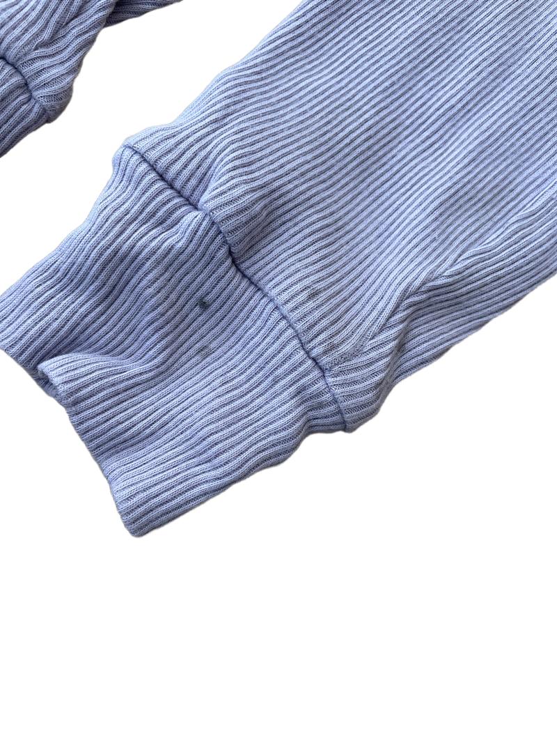 This gorgeous three-piece outfit is perfect for your little one. It includes a top, trousers, and hat, all in a beautiful shade of purple rib fabric. The top features a lovely ruffled collar. The trousers are soft and comfortable and the hat is ideal to keep your little one's head warm. There is a faint dark mark on the back left leg of the trousers - see photos.