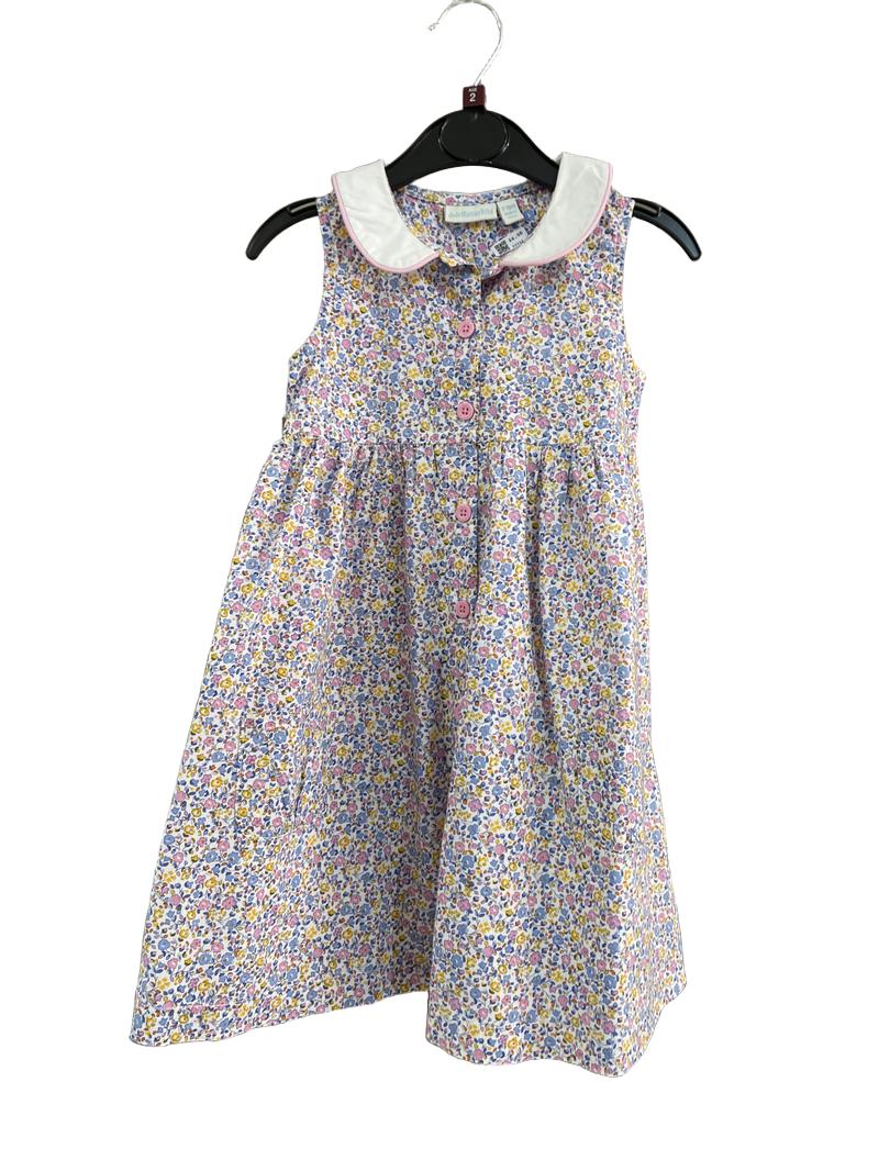 This lovely Jojo Maman Bebe sleeveless dress features a charming floral ditsy print with a white Peter Pan collar accented by a pink trim. Perfect for sunny days, it's a delightful addition to any little one's wardrobe.